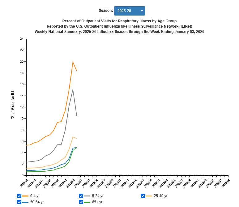 That’s why respiratory virus seasons almost always peak near late December and begin declining near January 1 — not after the holidays, but during them.